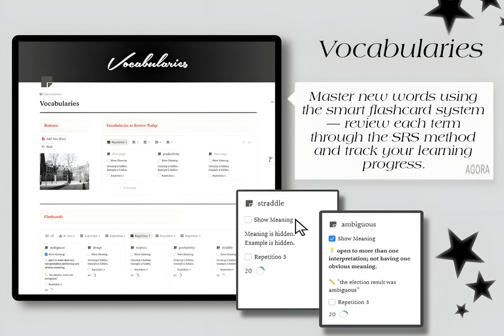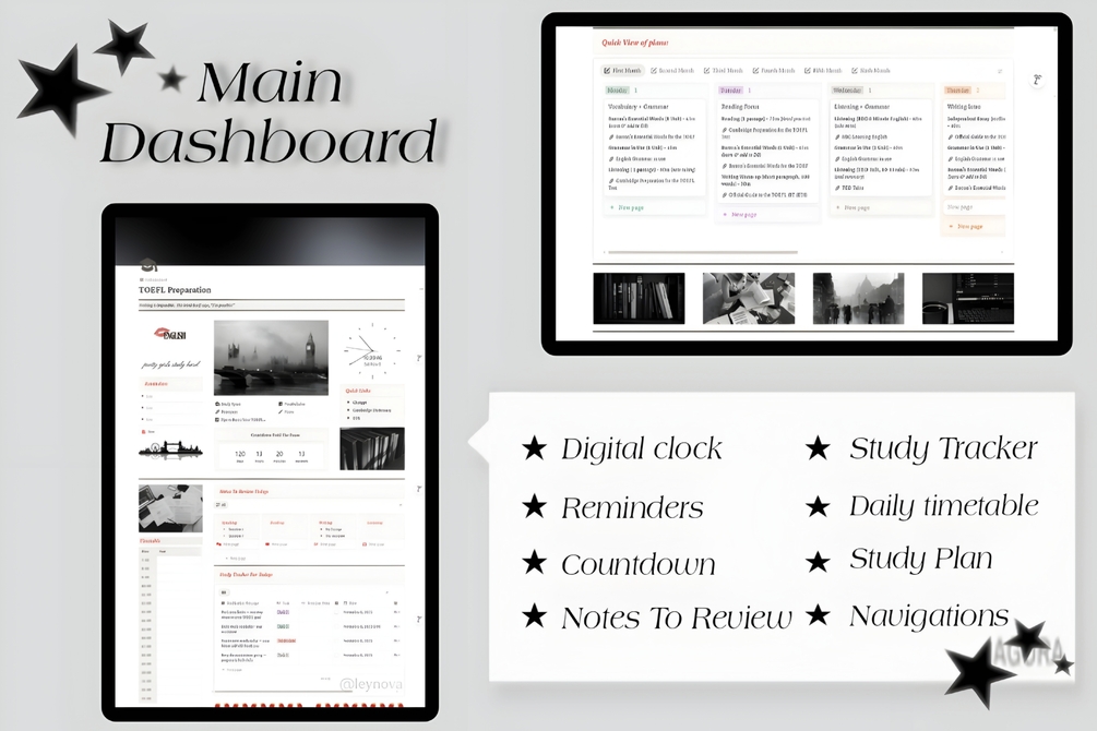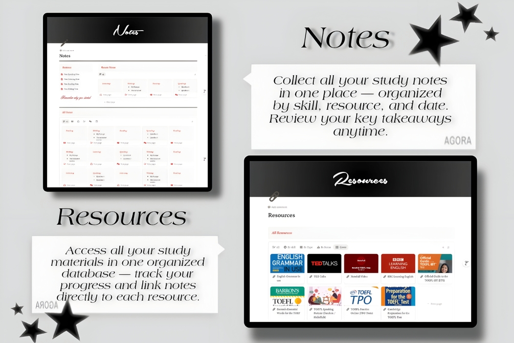 🎓 A complete, automated Notion system for your TOEFL journey. Track your progress, review vocabulary with SRS flashcards, follow a 6-month study plan, generate daily tasks automatically, and keep all your notes and resources organized in one clean dashboard. 🚀 Study smarter — not harder.